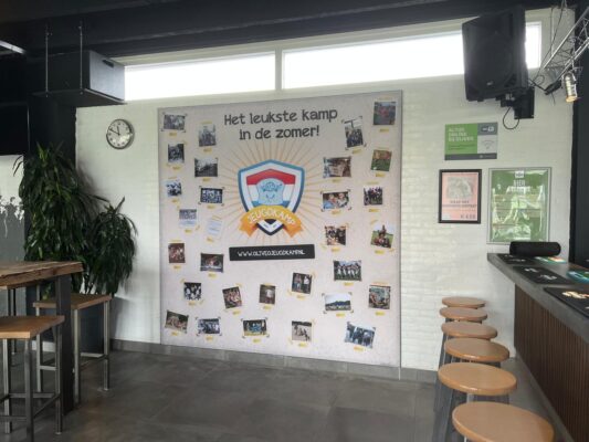 Om stil te staan bij ons jubileum hebben we in de kantine ook een speciale kampmuur ingericht. Hierop zie je een mooie verzameling foto’s van toen en nu. Een uniek kijkje in 80 jaar jeugdkampgeschiedenis en leuk om eens rustig te bekijken.