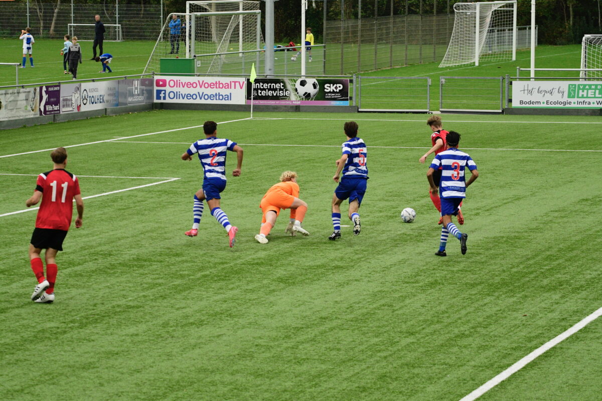 Oliveo probeerde van alles maar kon geen vuist maken. Pas de laatste tien minuten van de eerste helft kwamen de gastheren er af en toe goed uit. Bij een aanval vlak voor rust werd Nick Toussaint gevloerd en mocht Oliveo aanleggen voor een strafschop. Noah Boer wist hier net als vorige week wel raad mee, 1-2