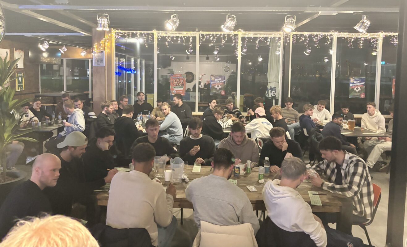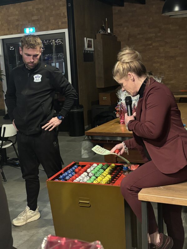 De strijd om de prijzen was fanatiek, maar altijd met een vrolijke noot. Verschillende selectiespelers, begeleiding en andere aanwezigen gingen er met mooie prijzen vandoor. En zoals het bij een échte bingo hoort, bleef een valse bingo niet onbestraft: een enkeling moest geen liedje zingen maar zich overgeven aan een ‘Atje voor de sfeer’ !